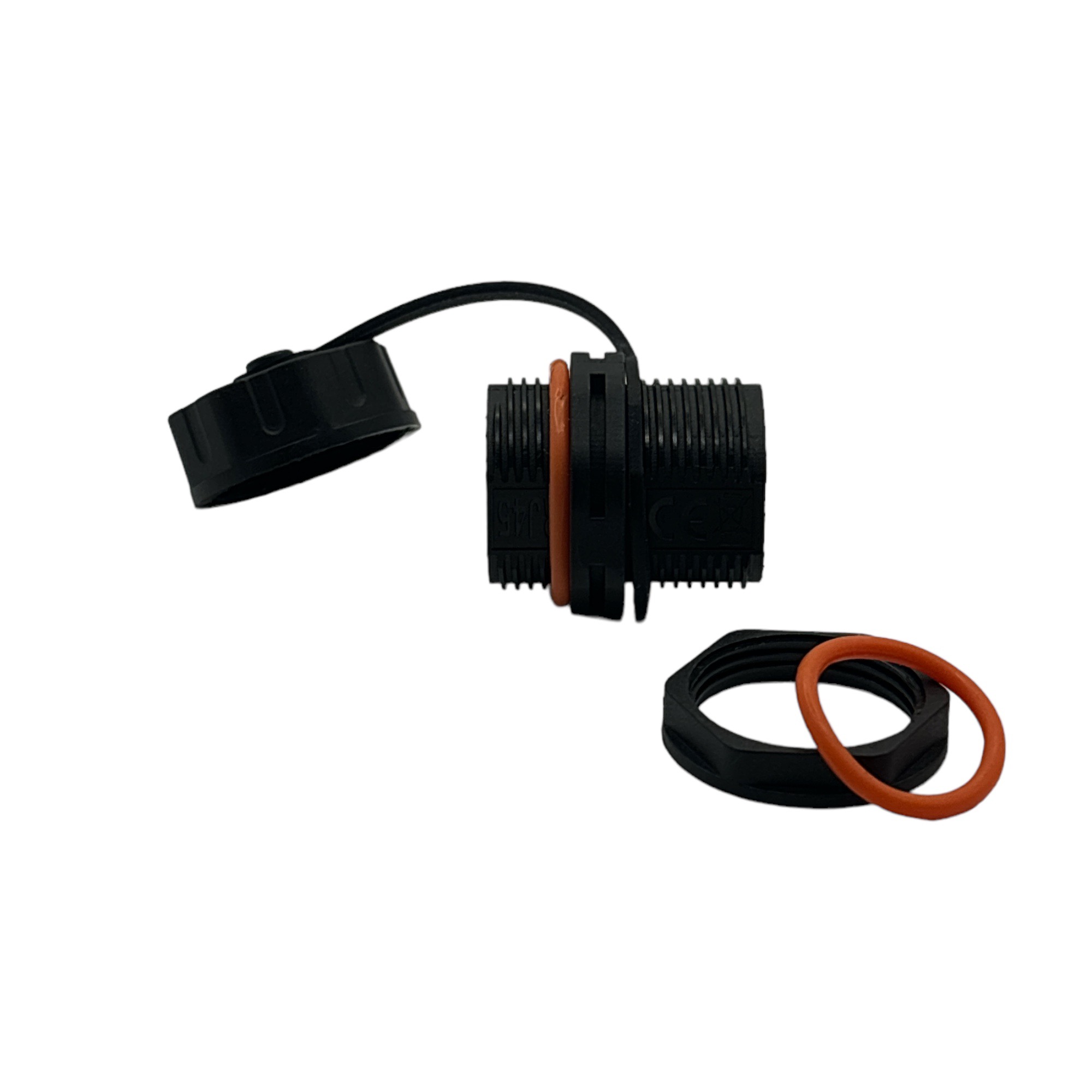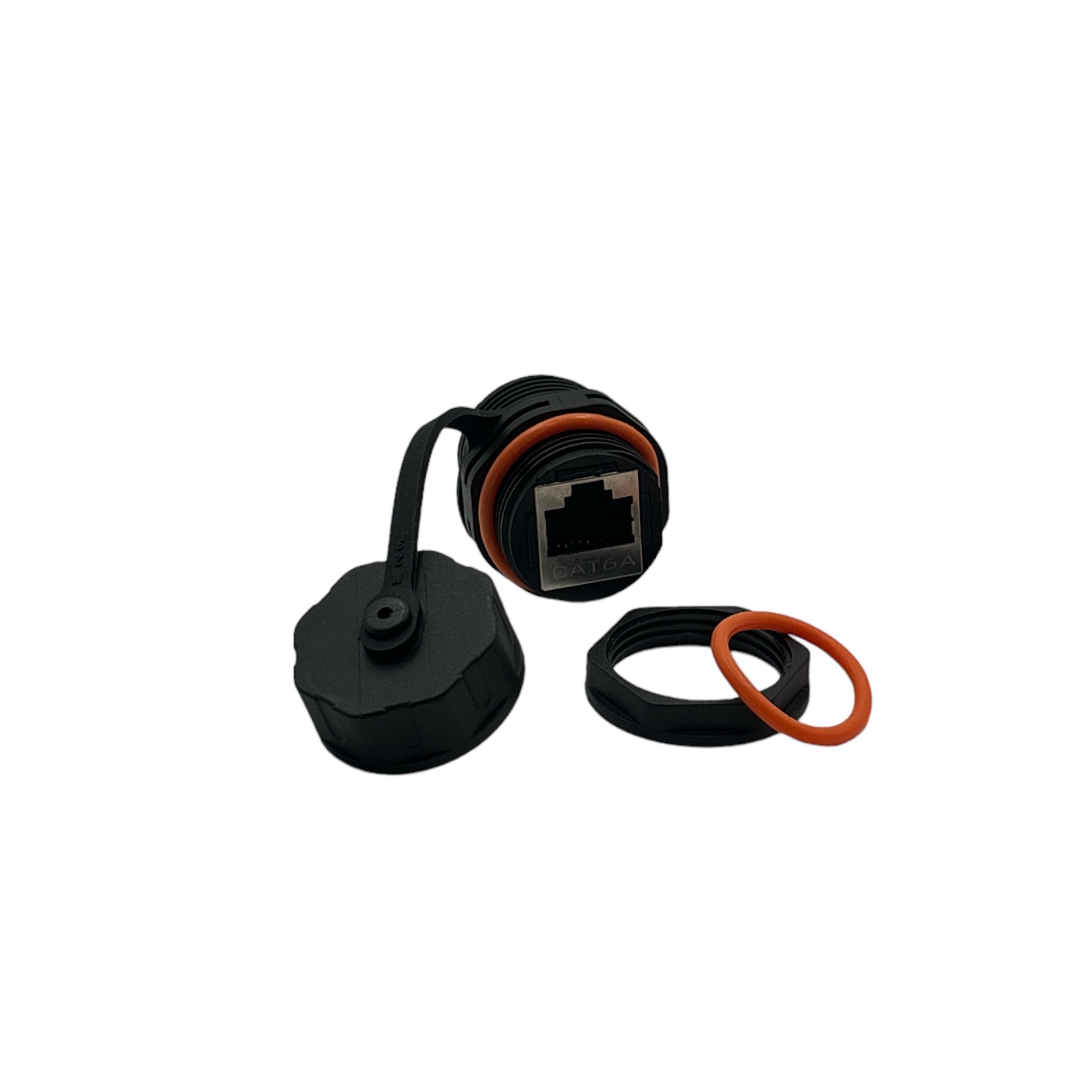 These Cat6A waterproof couplers from Talkitt Connectivity are IP67/IP68 rated for water resistance in the harshest environments. Coupler provides feed-through CAT6A RJ45 Ethernet connectivity for data and PoE in industrial environments. The panel mount RJ45 connector has a waterproof cover with rubber o-ring which provides superior water resistance and sealing. The nylon PA66 shell is highly flame retardant. Contacts are gold plated. Reverse compatible with Cat6 and Cat5e cabling.